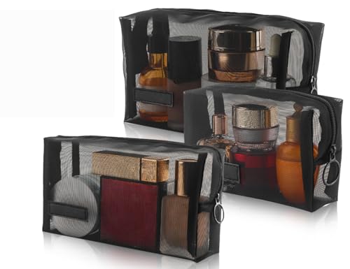 Lhbwhiz 3 stycken nätsminkväska med dragkedja, praktisk bärbar trendig mini mesh necessär flygplansväska, för resor smink läppstiftsorganisation (svart, 3 storlekar), svart