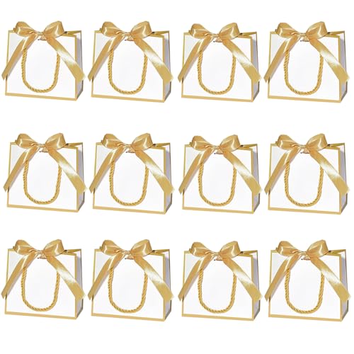 12 st små presentpåsar med handtag, mini tack-presentpåsar med band för bröllop baby shower födelsedag del (vit, guld, 12-pack)