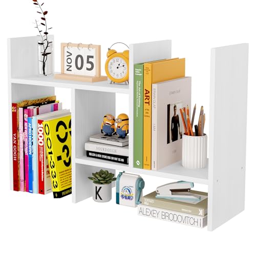 EasyPAG Trä små skrivbordshyllor justerbar mini skrivbord bokhylla fristående bokhylla hem och kontor skrivbord prydlig litteratur organiseringshylla Vitt