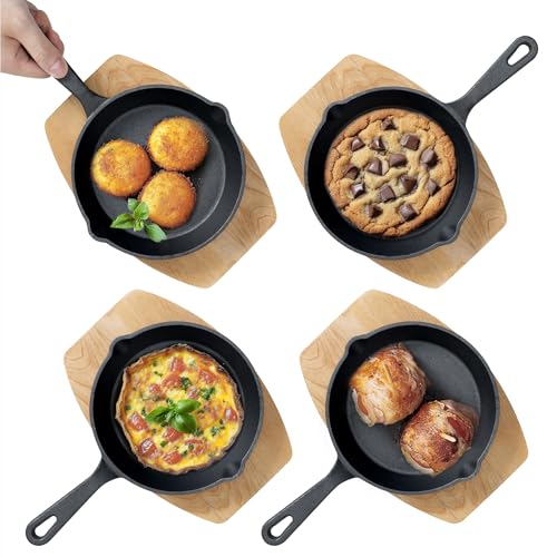 Navaris Mini gjutjärnsstekpanna med träbas (set med 4) – gjutjärn stekpanna ministekpanna med skyddande träbas – kraftig metallstekpanna väger 426 g