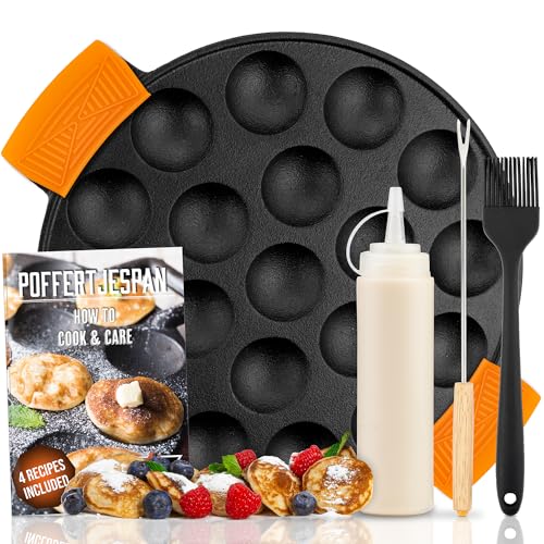 IRONO Poffertjes Panna - Poffertjes Maker - 19 Mini Pannkakor - Poffertjes Pan Recept - Stekpanna i Gjutjärn - Inklusive Smörpensel, Gafflar, Degflaska