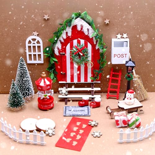CaiTang 30 stycken julälvhållare kit, julälvshus dekorationer, trä julälvshållare, miniatyr juldekorationsset, tomtehållare set, gör-det-själv kit mini älvdörr