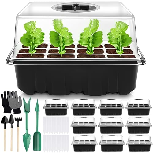 MIXC 10 set fröbrickor fröstartsats, 60 stora celler mini propagator växtkit med fuktighet ventilerade kupoler och bas för frön som startar växthus (6 celler per bricka) – svart