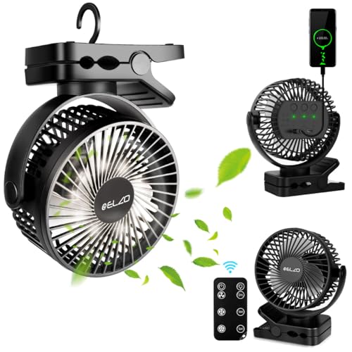ELZO Campingfläkt på 12 000 mAh, uppladdningsbar bordsfläkt, USB-minifläkt med LED-lampa och krok, 360° rotation, tyst fläkt med fjärrkontroll, klämfläkt för skrivbord, barnvagn och kontor