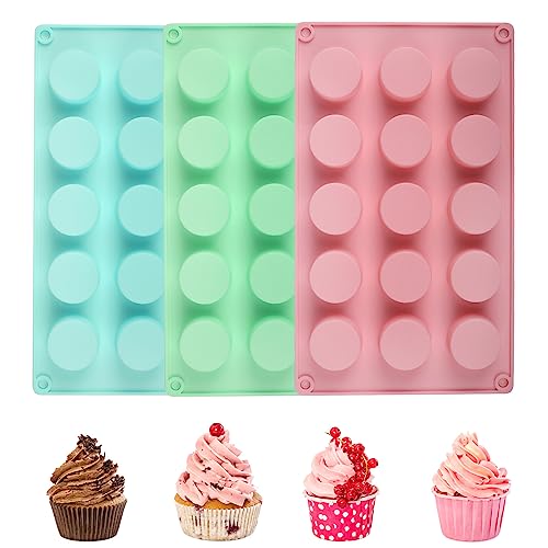 RNHDLY Mini muffinsform silikon 3 stycken 15 tråg minimuffinsform silikon, cylinder minimuffinsform i silikon, muffinsform för cupcakes, handgjord tvål, muffin, ostkaka, 3 färger