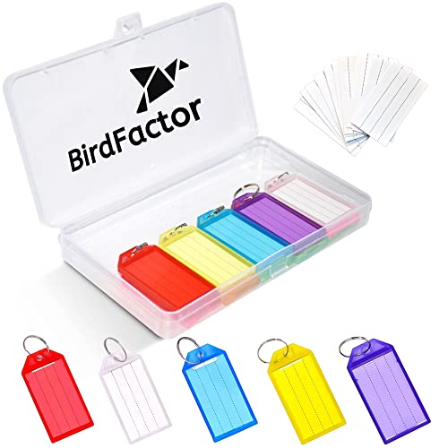 BirdFactor 25-pack kraftiga nyckeltaggar med etiketter – 5 färger, plastlåda med extra pappersetiketter, nyckelringar och nyckelringar med delade ringar för nycklar, husdjur, bagage och minnessticka