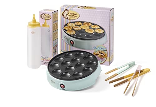 Bestron poffertjesmaker, värdepaket inklusive degflaska och 3 set serveringstång, perfekt för jul, påsk eller barns födelsedagar, retrodesign, 800 watt, färg: mint/gul
