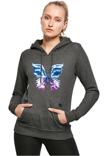 Miss Tee Huvtröja för kvinnor, Chromed Butterfly Hoody, avslappnad huvtröja med framtryck, normal passform, storlekar XS – 5XL, kol, XS