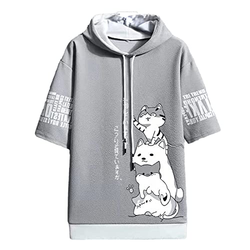 Män Kawaii anime kortärmad huvtröja japansk söt katt mjau t-shirt koreansk preppy blus toppar kläder vår sommar unisex, Ljusgrå, XL