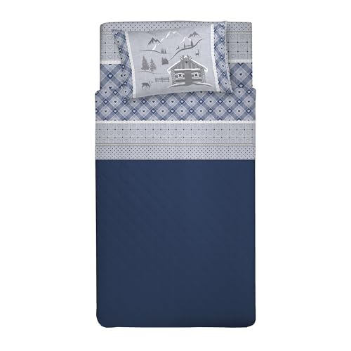PENSIERI DELICATI Set med 1 mellanstor säng, flanell i 100% varm och mjuk bomull, set med lakan 120 x 200 cm, inkluderar underlakan, över och 1 örngott, tillverkat i Italien, chalet blå