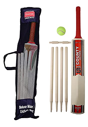 DIVCHI Barn cricketset gummigrepp träslagträ med 4 stubbar och och mjuk boll i nätväska (storlek 5, ålder - 8-12 år)