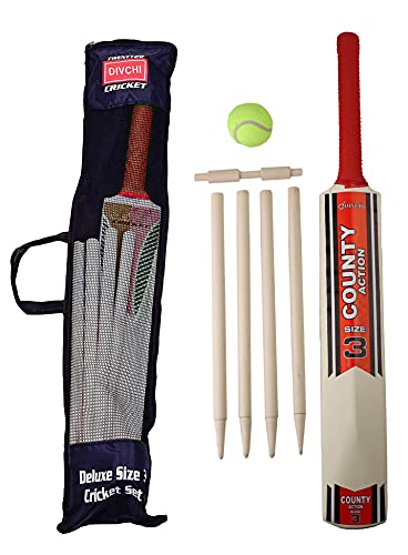 DIVCHI Barn cricketset gummigrepp träslagträ med 4 stubbar och och mjuk boll i nätväska (storlek 3, ålder - 8-11 år)