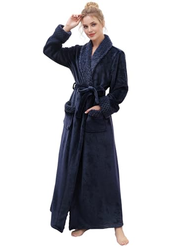 Lång badrock för kvinnor plysch mjuk fleece badrockar nattlinne damer pyjamas nattkläder husrock, marinblå, liten medium