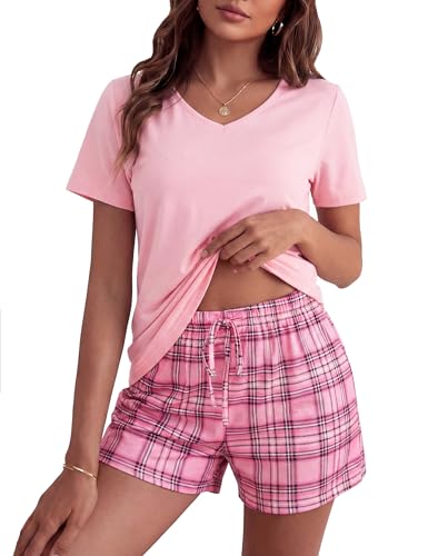 Bresdk Pyjamas Dam Sommar Kort Bomull Pyjamas Set Kortärmad Plus Storlek V-ringad T-shirt och Rutig Shorts Mjuk och Bekväm, A – rosa, L