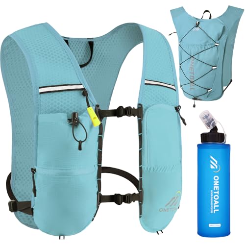 ONETOALL Löparväst för kvinnor med 500 ml vattenflaska, reflekterande vätskeryggsäck, 6 L, lätt 150 g, för trailrunning, vandring, maraton, blå med mjuk flaska