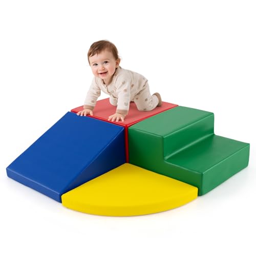 COSTWAY 4 delar. Skumbyggstenar, jättebyggstenar för tov och klättring, mjuka byggstenar av skum, stora byggstenar, byggklossar för förskolebarn, spädbarn och skolbarn (röd-färgglad)