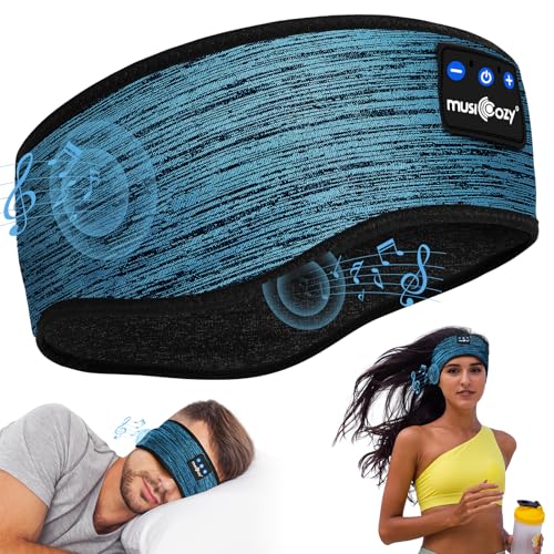 MUSICOZY Sömnhörlurar pannband Bluetooth mjuka hörlurar för sömn och sport med tunna högtalare, trådlösa musikhörlurar tekniska gåvor för män kvinnor tonåringar (blå och svart)