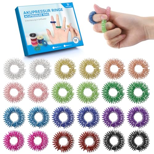 YANGTSUNG 24-Pack Akupressurringar, 27 mm Spikiga Fingerringar för Att Främja Blodcirkulation, Stressavlastning, Massage Fidget Ringar för Tonåringar 14+ och Vuxna (Flerfärgad)