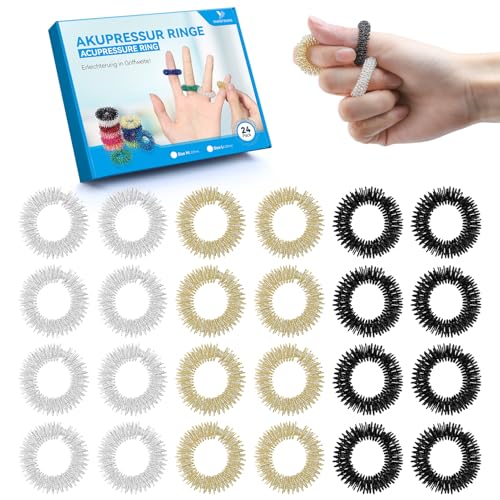 YANGTSUNG 24-Pack Akupressurringar, 30 mm Spikiga Fingerringar för Att Främja Blodcirkulation, Stressavlastning, Massage Fidget Ringar för Tonåringar 14+ och Vuxna (Guld/Silver/Svart)