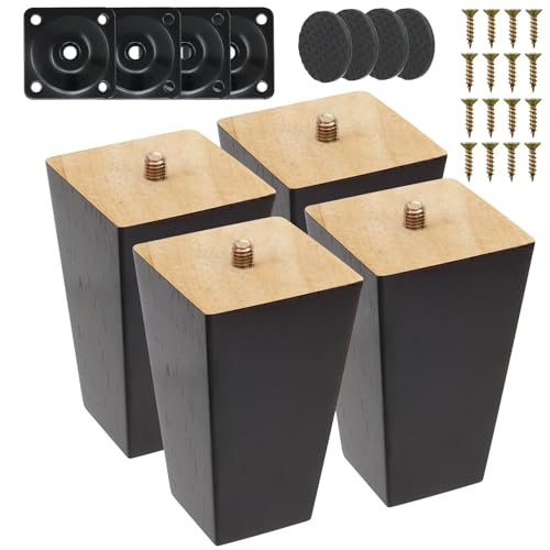 Fomiata 4 stycken möbelfötter i trä, möbelben 10 cm, massiva ben av ek med monteringsplattor, skruvar och filttassar, för soffa, säng, skåp, soffa stol (svart)