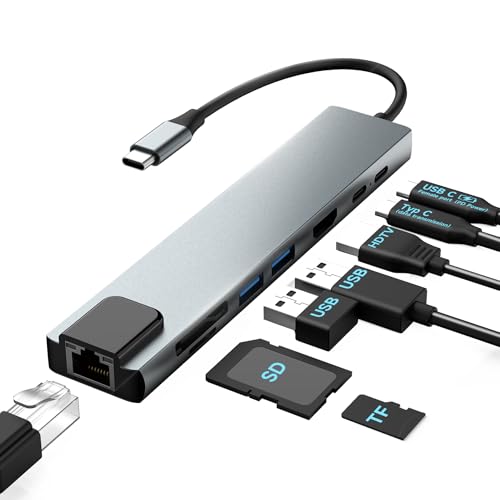 Moman dockningsstation, USB C Hub 8 i 1 med 100 W PD, 4K@30 Hz HDMI, 5 Gbps USB 3.0, USB C, RJ45 Ethernet, SD/TF-kortläsare för mus, tangentbord, U-disk, flashdrive, mobil