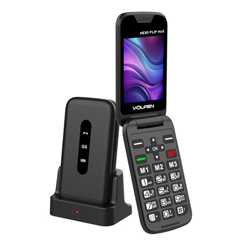 Volfen Nexo Flip Max Flip-mobiltelefon för seniorer, knappar och stora knappar, lätt att använda, USB-C, 3 direktminnen, laddningsbas, svart
