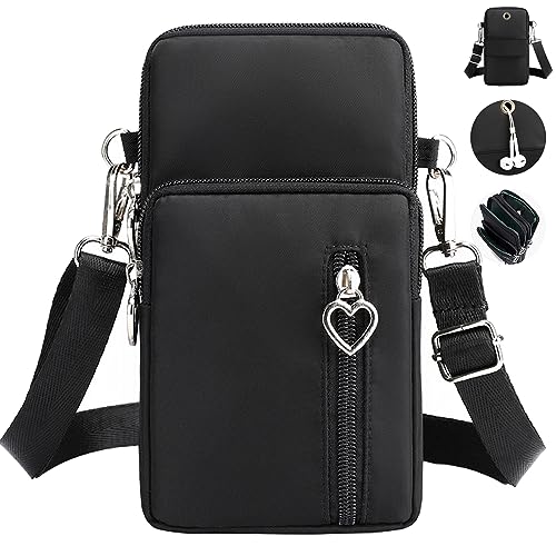 Mikqky Mobiltelefonväska för upphängning, dam, mobiltelefon axelväska, crossbody mobilväska, mobilväska med axelrem, nylonaxelväska med hål för hörlurar, 7 x 4 x 2 tum, för vardagen, utflykt (svart),