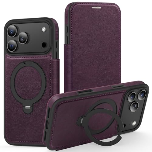 QYFCOU Fodral för iPhone 17 Pro Max vikbart fodral 360° vridbar magnetiskt stativ, PU-läder mobilväska läderfodral med kortfack RFID-lås skyddande fodral – lila