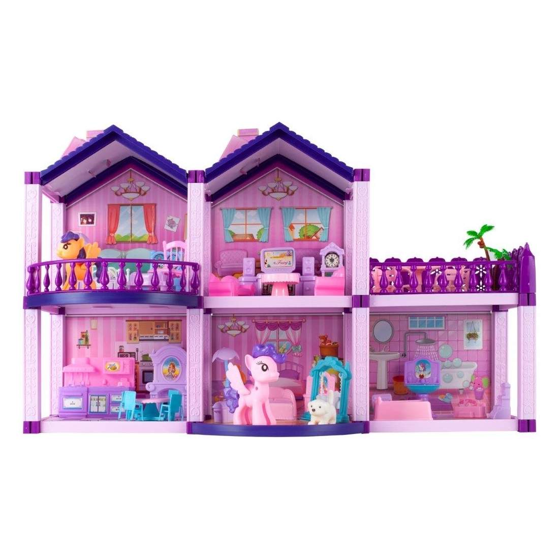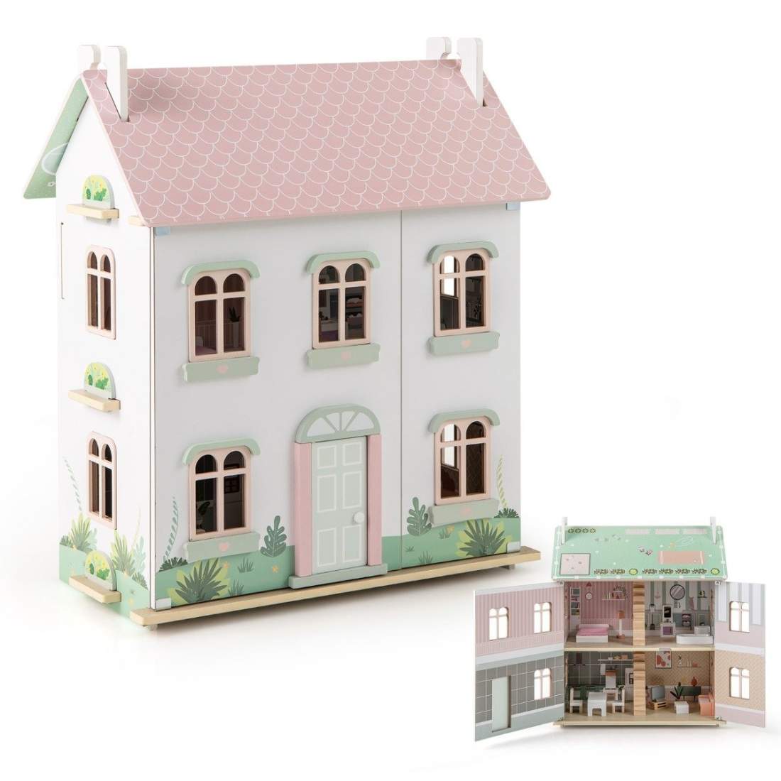 3-vånings dockhus i trä med möbler & tillbehör docka villa tjej rosa
