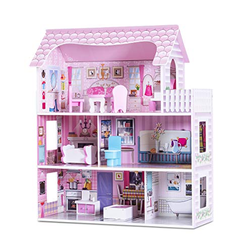 UISEBRT Dockhus i trä, trädockhus med 3 våningar möbler och tillbehör, dockhus Lekset för barn från 3 år, typ B, ELC1073