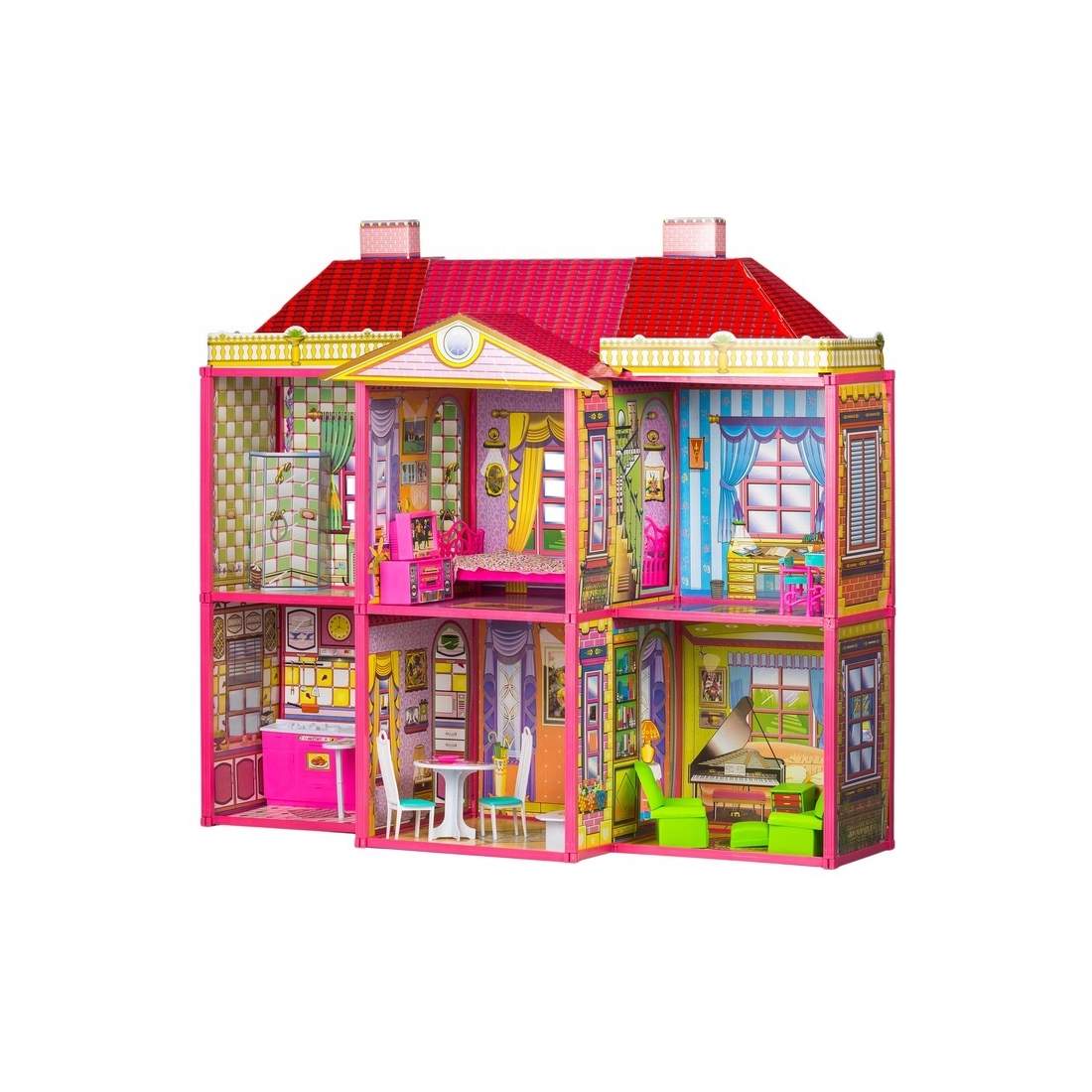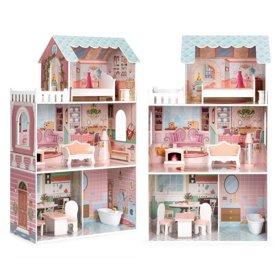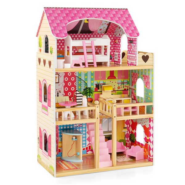 Dockhus i trä med 3 våningar & 10 möbler & 5 rum dockhus drömhus rosa
