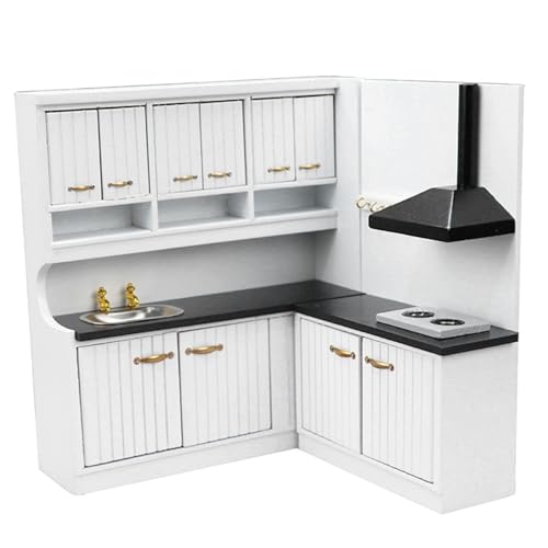 Porgeel Dollhouse kök 2 st mini köksset 1/12 skala trä miniatyr spis skåp & handfat, dockhus möbler matsal tillbehör