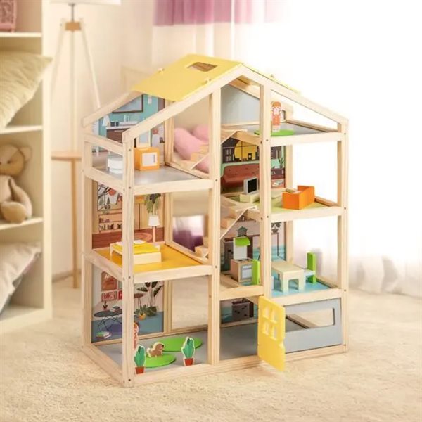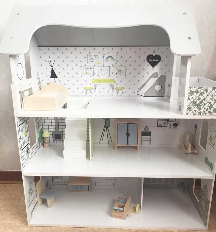 Dockhus i trä – 3 våningar, 15 möbler, 6 rum