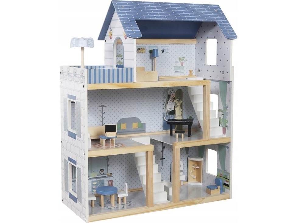 Jokomisiada Blå Trä Blå Dockhus + Möbler 3 Våningar Terrass Za5273