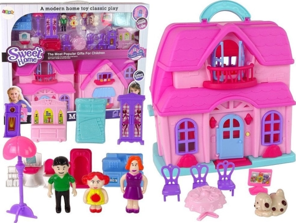 Hörndockahus i trä med rosa tak & 41 möbler och tillbehör Dockhus Gör-det-själv drömhus