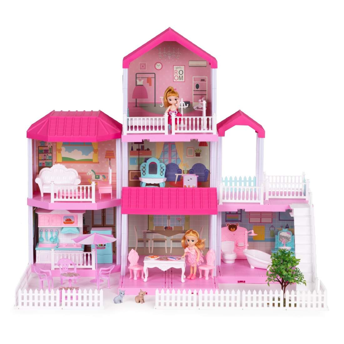 Dockhus i trä, 3-vånings lekstuga, 13 möbler, flyttbart garage, rutschkanor och balkong, 36-tums dockskåp för 3-6 år barn, rosa