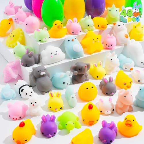 JOYIN 48 förfyllda påskägg fyllda med 48 Mochi Squishy-leksaker för barn, påskäggsfyllning, festtillbehör, för påsktemafest, favorit, påskäggsjakt, påskkorgar