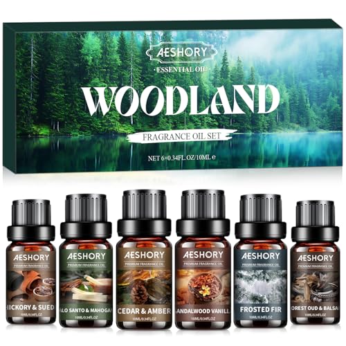AESHORY Skogsmark Eteriska Oljor Set 6 x 10ml, Aroma Diffuser Olja Gift Set, Naturlig Aromaterapi Oljor Doftoljor för Diffusorer - Hickory & Mocka, Sandelträ Vanilj, Frostad Gran, Palo Santo & Mahogny