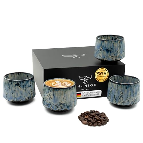 Pheniox | Cappuccino kopp set Tibet Blue | 4 delar | 180 ml | högkvalitativa muggar av stengods | utan handtag | diskmaskinssäker | kaffe | espresso | mocka | present man kvinna