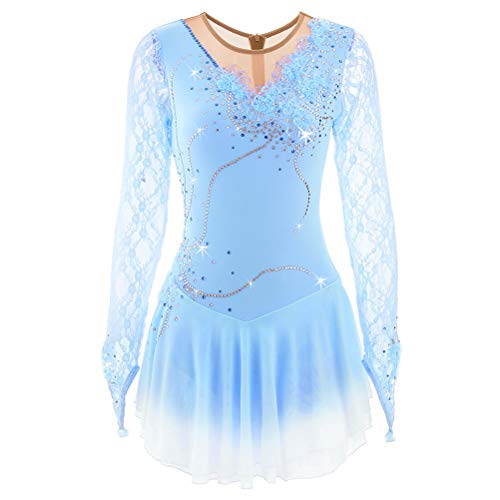 Flickors klassiska konståknings klänningar spets långärmad Rytmisk gymnastik Speklösa för professionell Mode gradient Barn skridskor tävlingskjol,Blue,S