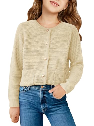 Haloumoning Flicka stickad tröja med rund hals långärmad kofta tröja barn mode lätt kofta, Aprikos, 5-6 År