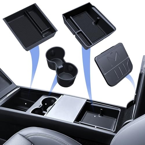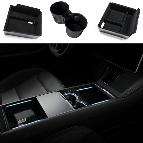 LANGBEAN Förvaringslådor Mittkonsolen för Tesla Model Y Juniper 2025, Armstödsorganisatör för Tesla Model 3 Highland 2024 2025, Mugghållare, Tesla Tillbehör, 3 Delar Svart