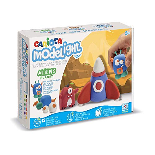CARIOCA Modelight Maxi Aliens | Ultralätt modelleringspasta för barn, Maxi mjuk och elastisk modelleringslåda 5 år och +, 12 olika färger, modelleringsverktyg och handledning ingår, 180 g