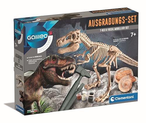 Clementoni Galileo Discovery – utgrävningsset T-Rex & Fossil modelleringsset – forskarset med dinosauriefigurstativ inkl. hammare, mejsel och modelleringspasta för barn från 7 år från Clementoni 59311