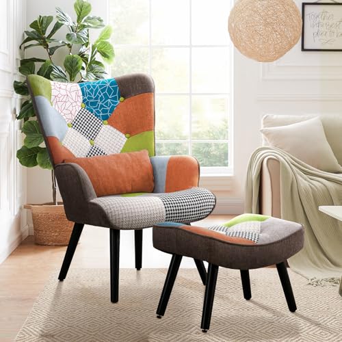 HomeMiYN Relaxfåtölj med pall lapptäcke fåtölj med ländryggskudde öronfåtölj träfåtölj vardagsrum modern TV-fåtölj loungefåtölj stol lapptäcke linne massiva träfötter orange