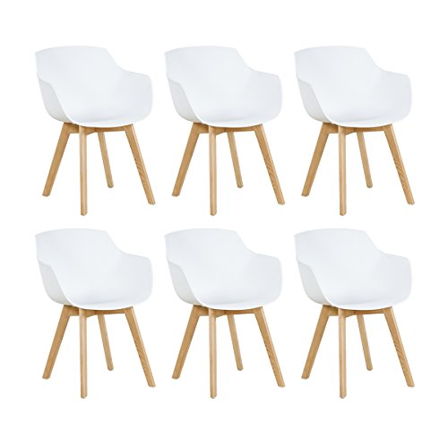EGGREE Set med 6 matstolar skandinaviska med armstöd och starka stolben i bok, modern design, fåtölj för kontor, kök, vardagsrum, vit
