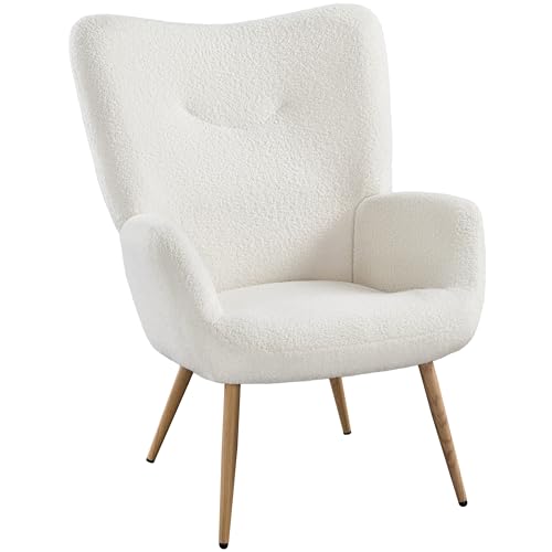 Yaheetech 1 x modern fåtölj av teddy-plysch öronfåtölj armfåtölj ryggstöd stoppstol med träben kan belastas upp till 136 kg vit