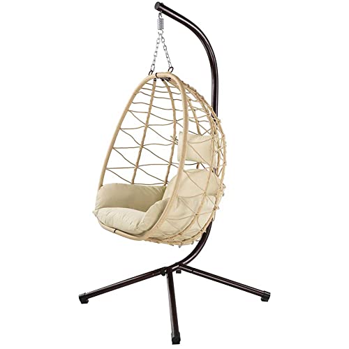 Bakaji Trädgårdshängande fåtölj gungstol hängmatta utomhus väggskåp metallram rotting rep + vadderad sittkudde och nackstöd modern design 198 x 110 x 95 cm (beige)