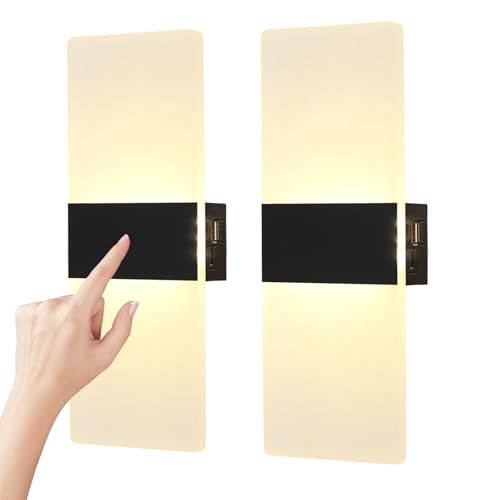 VOMI 2 stycken LED-vägglampor för inomhusbruk, moderna, USB-uppladdningsbar touch-kontroll, vägglampa för barnrum, vardagsrum, sovrum, hall, belysning, justerbar ljusstyrka, väggbelysning, varmvit