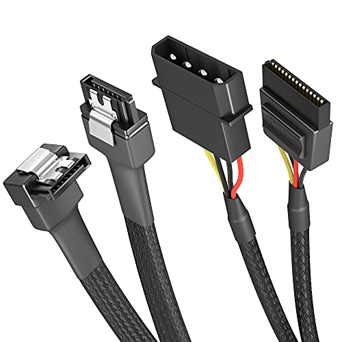 KabelDirekt – 30 cm 4-stifts Molex till 2 x 15-stifts SATA-strömkabel + 60 cm 7-stifts SATA-3 datakabel 6 Gbit/s 90° vinklad + 60 cm 7-stifts rak